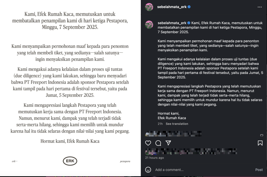 Sekitar pukul sepuluh malam, saya menyadari unggahan Pestapora 2025 di Instagram dengan logo dan keterangan sponsor Freeport telah dihapus. Seorang teman menyebar informasi lingkaran elite Pestapora, bahwa beberapa jam sebelum postingan Instagram dihapus, diadakan pertemuan serius dan para musisi memprotes penyelenggara Pestapora tentang isu ini. Sebab, komentar dan percakapan di berbagai kanal media sosial telah penuh sesak. Warganet banyak memprotes, marah, dan mengajukan tuntutan pada Pestapora.